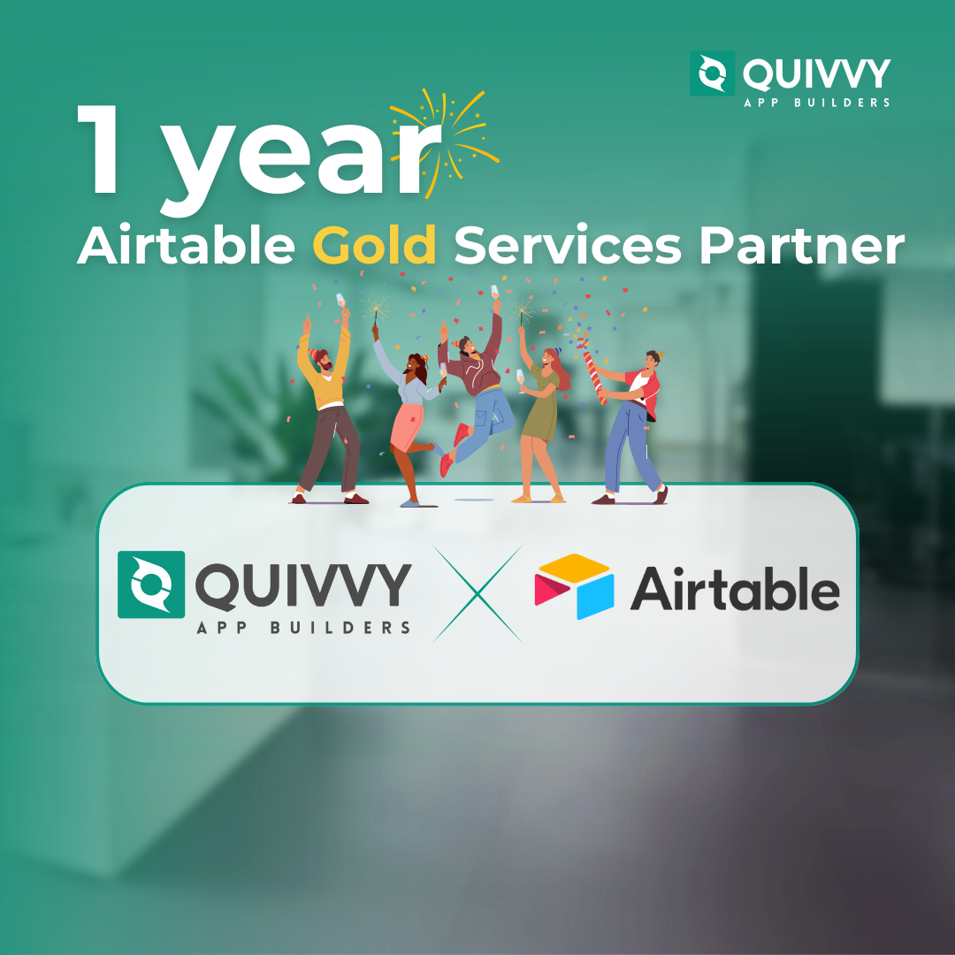 Quivvy Solutions celebrates 1 year as an Airtable Gold Services Partner.We’ve got something to celebrate! It’s been exactly one year since Quivvy Solutions achieved Airtable Gold Services Partner status, and we’re still just as proud today as we were then.What does being a Gold Partner really mean?This recognition is awarded directly by Airtable to consultants who demonstrate technical expertise, a proven track record of customer success, a strong focus on scalability and usability, and consistently high levels of client satisfaction. Here’s to many more years of building, automating and optimizing together! 🥂